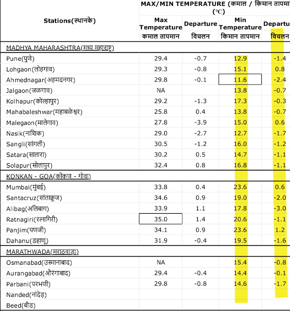 Pune, Kolhapur, Satara, Mahabaleshwar: 14th - 16th November : Cloudy weather with nights getting warmer. Pune could see cloudy skies with lows around 19/20°. Light rains/drizzles possible.